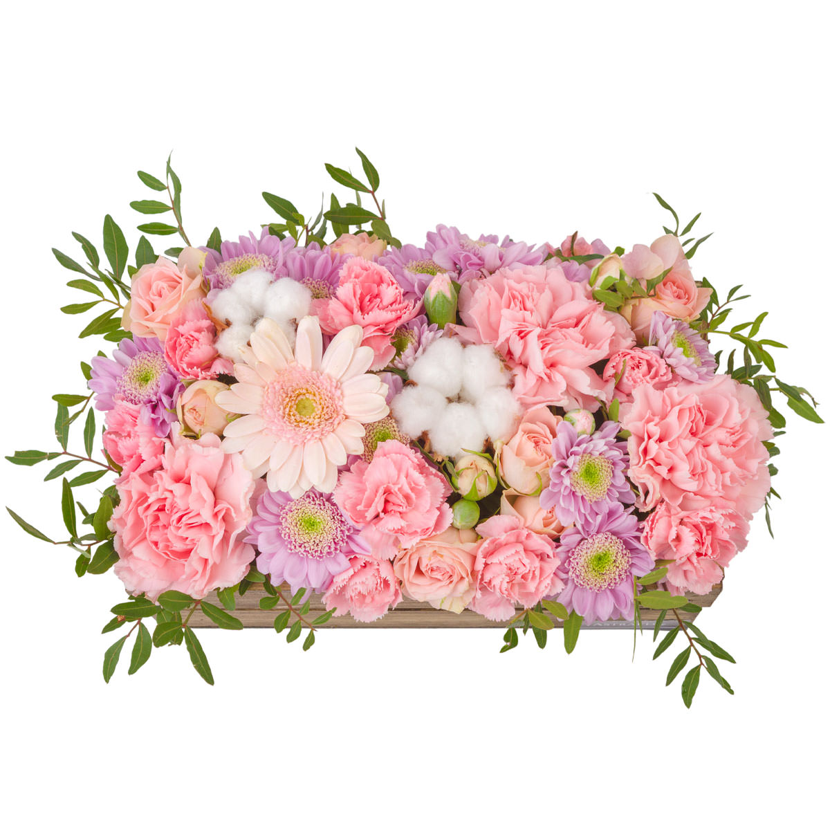 Гербера сиреневая и розовая, гвоздика розовая, роза кустовая розовая, хлопок, фисташка. Упаковка (Корзина, оазис, ящик).